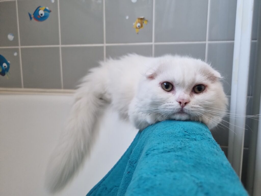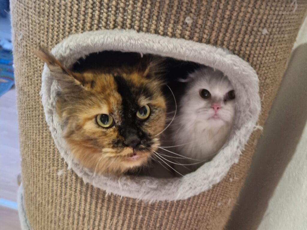Die weiße heißt Luna, ist ungefähr 2 Jahre alt und eine Scottish Fold Mix. Sie miaut wenn sie gestreichelt werden möchte, ist an für sich eine sehr kuschelige Katze und sucht auch immer Kontakt zu der anderen Katze und Menschen, die sie kennt. Wir haben sie selbst letztes Jahr aus einem anderen Haushalt geholt, da sie dort sehr verwahrlost war (ihre Augen waren stark entzündet, ich hatte Bange, dass sie erblindet. Sie hat sich nach Behandlung sehr gut erholt und seitdem ist auch Ruhe).