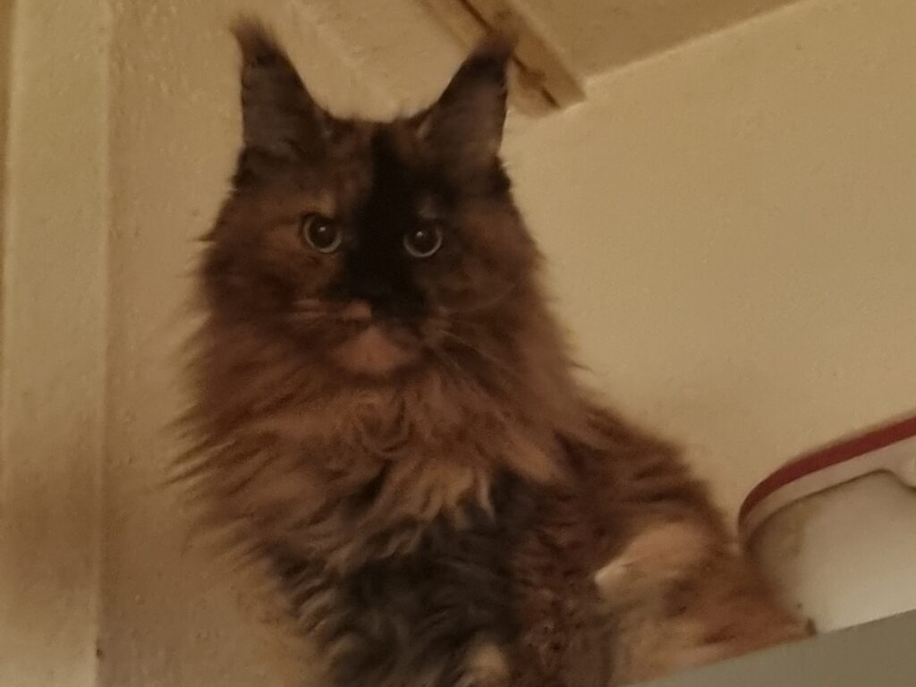 Die bunte heißt Foxy, ist ungefähr 8 Jahre alt und eine Maine Coon mit Stammbaum. Sie ist gechipt. Sie ist eine ziemlich ruhige Katze, kuschelt nur wenn sie es mag, geht meist ihren eigenen Weg. Seit der Kastration versteht sie sich viel besser mit der anderen Katze, davor haben sie sich sehr viel angefaucht und gestritten.