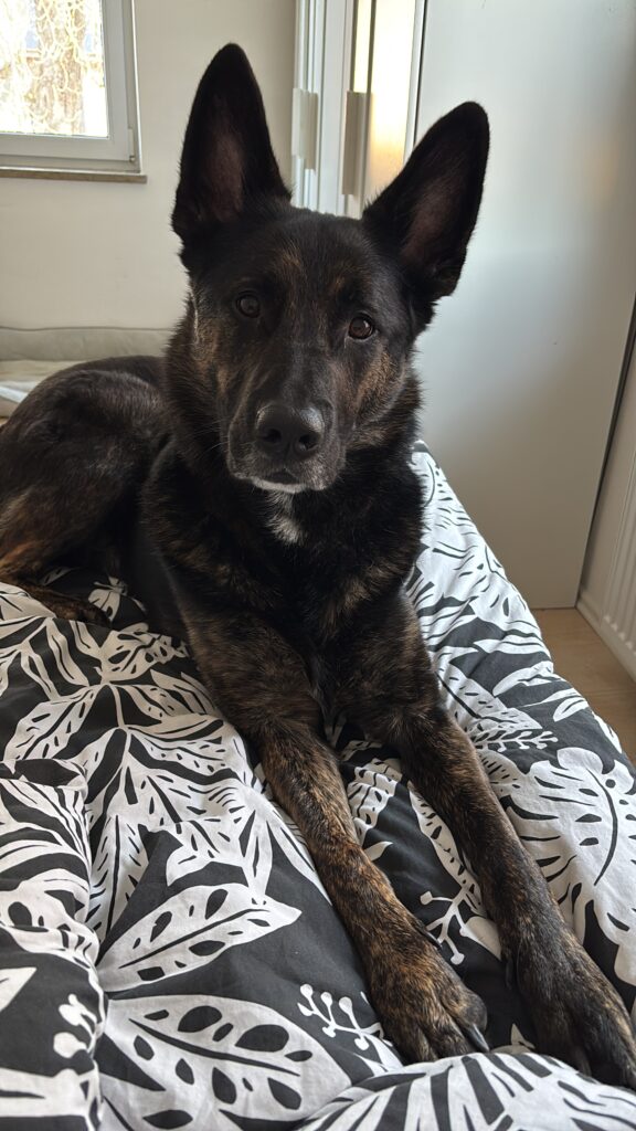 Wir haben Baghira Ende Juli 2023 mit 7 Monaten über einen Tierschutzverein aus der Slowakei bekommen, zuvor war sie in diversen anderen Zwischenstationen. Baghira ist sehr fixiert auf uns als ihre Bezugspersonen, unglaublich verschmust, intelligent und futtermotiviert. Sie beherrscht viele Kommandos, fährt toll im Auto mit und kann bis zu maximal 5,5 Stunden problemlos allein bleiben.