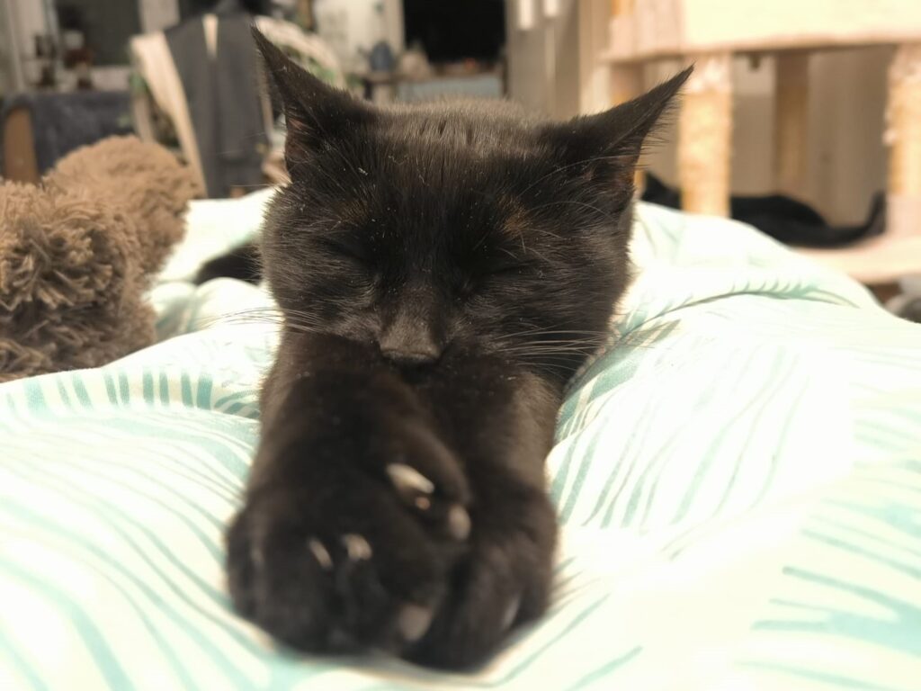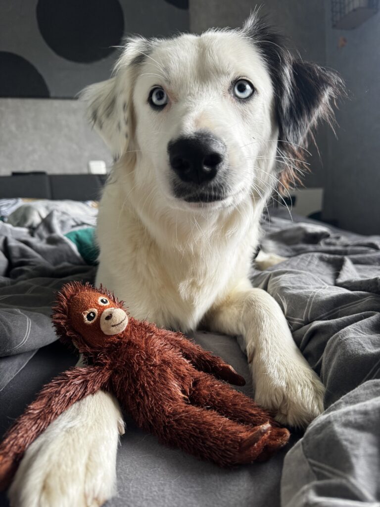 Ich liebe es zu kuscheln und bei meinen Menschen im Bett zu schlafen, Alters entsprechend spiele ich aber auch gerne.