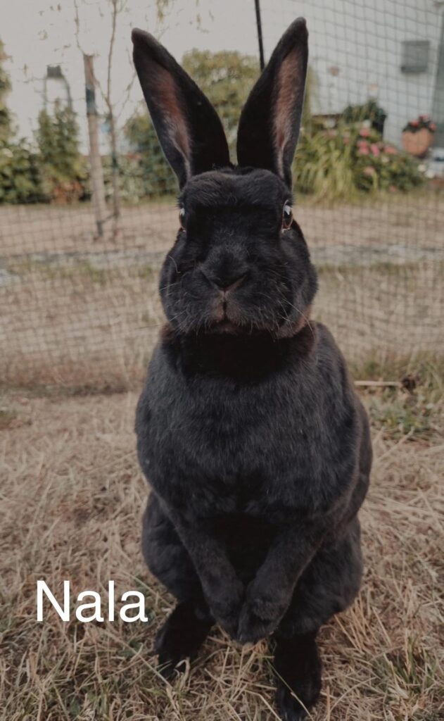 „Ich bin Nala, die Schwester von Momo und bin auch im Dezember 2020 geboren. Auch ich bin ein reinrassiges schwarzes Rex-Kaninchen und wurde zusammen mit meiner Schwester von einem Züchter gerettet. Meine „Mama“ sagt zwar immer, ich bin die Rangniedrigste, aber auch ich zeige manchmal den dicken Mitbewohnern, wo es langgeht. Ausgeschlossen werde ich natürlich nie, ich kuschel immer, mit wem ich möchte. Leider habe ich nicht so viel Glück wie meine Schwester und hatte Probleme mit Pododermatitis an meinen Hinterläufen. Aber meine Mama hat sich super um mich gekümmert, wir waren regelmäßig beim Tierarzt und mittlerweile geht es mir seit einem Jahr super gut. Klar, man muss ab und an mal meine Füße kontrollieren aber Mama sagt immer es sieht alles super aus. Ich lebe ganz ohne Schmerzmittel und ich brauche auch keine Zusatzversorgung mehr. Falls jedoch mal was sein sollte, Schmerzmittel, Cremes, Kaninchenschuhe und so weiter sind alles vorhanden, wobei ich hoffe, dass ich diese nicht mehr brauche.“