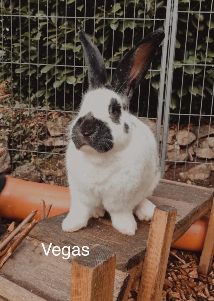 „Hallo Leute, ich bin Vegas, der schwarz-weiße Deutsche Riese, und bringe mittlerweile bestimmt fast acht Kilo auf die Waage. Aber was soll ich machen, ich ess halt einfach gerne. Ich wurde von unserer Mutti im September 2021, zusammen mit dem schwarzen Dicken, aus dem Tierheim adoptiert und lebe seitdem mein bestes Leben. Mir ist es leider ein bisschen anzusehen, dass ich in einem viel zu kleinen Stall gelebt hab, als ich noch klein war. Daher habe ich leider, noch mehr als mein Bruder Rio, etwas krumme Vorderbeine. Aber das stört mich überhaupt nicht. Auch ich bin ein ganz ganz Lieber, lass mich sehr gerne streicheln und bei Snacks bin ich sowieso dein Freund. Manchmal habe ich aber auch mal schlechte Laune und dann zoffe ich mich bisschen mit meinem Bruder Rio. Da wir aber beide doch etwas molliger sind, sind auch diese Streitereien recht schnell vorbei, da wir schnell außer Puste sind. Dann haben wir uns doch wieder lieb. Auch ich habe keinerlei gesundheitliche Probleme.“