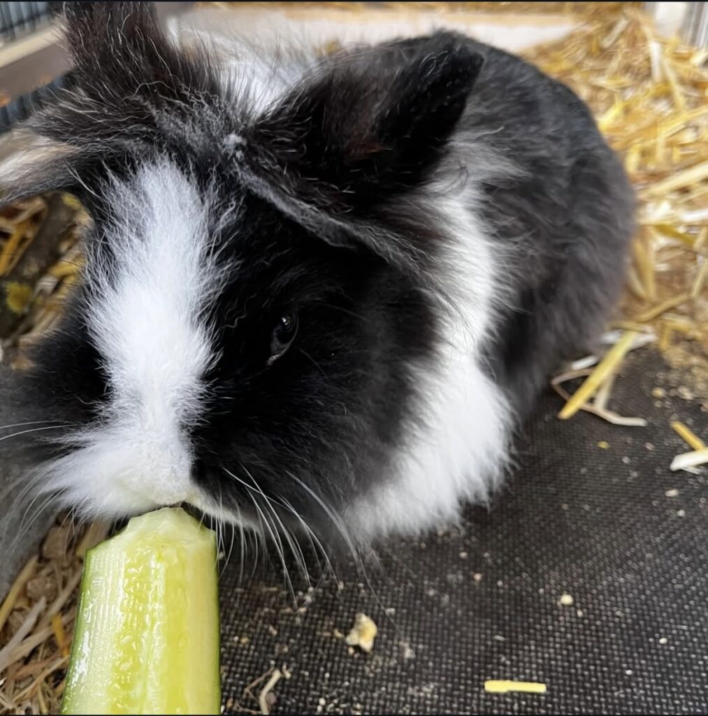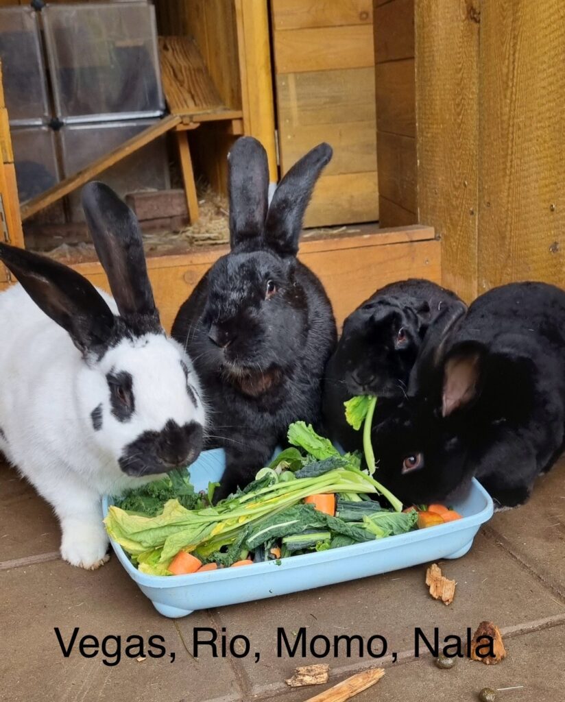 „So, nachdem sich nun die Kaninchen mal selber vorgestellt haben, melde ich mich jetzt auch einmal zu Wort. Ich bin die „Mama“ von dieser wunderbaren Vierergruppe. Leider ist es mir auf Dauer zeitlich und vorallem finanziell nicht möglich, mich alleine um alle vier zu kümmern, da die Kaninchen leider „Trennungs-Kinder“ sind. Ich möchte meine Kaninchen nicht in irgendwelche Hände geben, sie sollen es mindestens so gut haben, wie bei mir. Sie leben in einer großen Gartenhütte mit mindestens 12 Stunden großem Auslauf am Tag. Sie werden ausschließlich artgerecht ernährt, d. h. sie kennen sämtliches Gemüse. Im Sommer werden sie fast ausschließlich mit Wiese ernährt, im Winter erhalten Sie Salate, Kräuter, Kohl und so weiter.🥬🥦🫑🍏🌱🌿 Alle vier Kaninchen kennen es, auch mal hoch genommen zu werden für Gesundheitschecks und auch, um Medikamente zu erhalten.